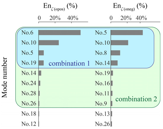 After determining the weighting factors using the mean sensitivity values of the positive incidence range and the negative incidence range, the ranking of the modes in can be determined based on the variance of the scaled data. Figure 7 shows the ordering of the eigenmodes corresponding to the sensitivity values of the positive incidence range and the negative incidence range, respectively. The definition of sensitivity-based energy ratio was as follows: