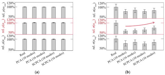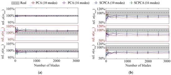 where and are the dimensionless mean value and standard deviation, and and denote the mean value and standard deviation of real blade profiles, respectively. In Figure 9, the heights of the gray bars indicate the statistics estimated from the 98 blade profiles, whereas the error bars represent the 90% CIs generated using the bootstrap method. In Figure 9a, for each blade set, the fluctuations corresponding to the 90% CI of the mean value are very small. This result shows that both the PCA and the SCPCA methods could provide a precise estimation of the blade mean performance. The wide CI in Figure 9b indicates that accurately assessing the standard deviation for the parameters of the aerodynamic performance was more challenging than it was for the parameters of the mean performance. The advantage of the SCPCA method is evident (see Figure 9b) as it can improve the accuracy for evaluating the scatter of positive incidence ranges while maintaining the accuracy for evaluating the scatter of other performance parameters. An noteworthy additional phenomenon is that both the PCA and the SCPCA methods tend to underestimate the scatter of blade performance when employing a small number of eigenmodes.