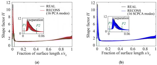 Comparison of the boundary layer shape factor on the suction surface: (a) real profiles (REAL) and reconstructed profiles (RECONS) using the first 16 PCA modes; (b) real profiles and reconstructed profiles using the first 16 SCPCA modes.