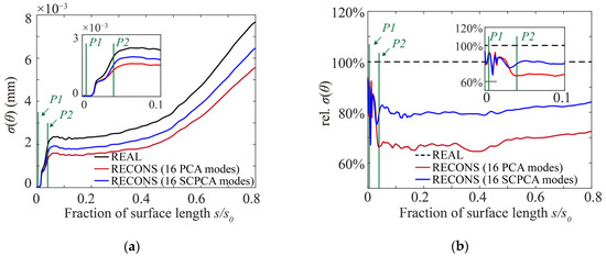 To further clarify the superiority of the SCPCA method for assessing the variance of the positive incidence range, Figure 14a shows the variation of the standard deviation of the boundary layer momentum thickness along the suction surface for different blade sets at the incidence condition of . Figure 14b is the same as Figure 14a, except the data has been normalized using the standard deviation of the boundary layer momentum thickness for the real blade profiles. In Figure 14a,b, upstream of the location of boundary layer transition (i.e., about P2 position), the standard deviations of the momentum thickness obtained from the two reconstructed blade sets are nearly identical. Downstream of the end of separation bubble transition regions, the SCPCA method was able to evaluate a scatter of the boundary layer momentum thickness much closer to the real one. Evidently, the separation bubble transition at the leading edge had a geometric sensitive flow structure, which significantly influenced the aerodynamic performance of all calculated blade profiles. This sensitive flow structure is critical for the prediction of the positive incidence range, as shown in Figure 6d. Due to the consideration of sensitive information in the SCPCA method, more attention was given on the modes which reflect the geometric variations in the regions where the sensitive flow structure occurs. As a result, the SCPCA method can provide a more accurate assessment of the scatter of the blade positive incidence range.