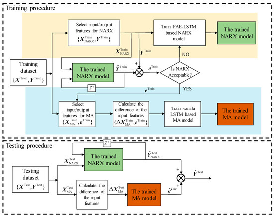 Figure 2 illustrates the design procedure for the proposed hybrid model. As can be seen in this figure, the NARX model is first trained, and the MA model is trained based on the acceptable NARX model. After the NARX and MA models are trained, the hybrid model can be used to predict the long-term EGT values according to the testing procedure in Figure 2. It should be noted that the inputs of the MA model are the differential values of the raw operating parameters of the engine.