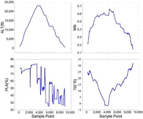Among more than 200 recorded parameters, we selected the parameters that can reflect the gas path performance of the engine according to [30,31]. The scenario descriptors, i.e., ALT, MN, PLA, and T0, determine the flight condition and are necessary for EGT prediction. Other gas path parameters, such as rotating speeds, temperatures, or pressures, can improve the prediction precision. The parameters used in this paper are shown in Table 1. The first seven parameters in Table 1 are thought to be correlated with EGT, and the last parameter, EGT, is the object parameter to be predicted.