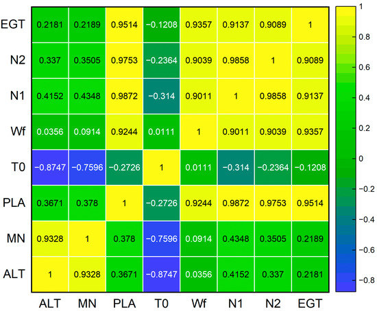 Figure 4 shows Pearson’s linear correlation coefficient (PCC) of the selected measurement parameters [32]. PCC is the most commonly used linear correlation coefficient, which is calculated through , where and denote the standard deviations of X and Y, and is the covariance of X and Y. As can be seen in this figure, PLA, Wf, N1, and N2 are strongly positively correlated to EGT, which means that they are likely to be very helpful for predicting EGT. ALT, MN, and T0 are the operating condition parameters, which are also important for EGT prediction, even though they are not as strongly correlated to EGT as the other parameters.