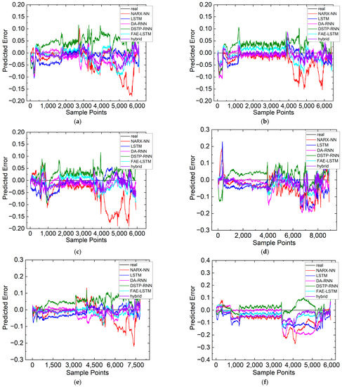 Comparison of the predicted errors of all models on the six flight cycles in the testing dataset. (a) #1 flight cycle, (b) #2 flight cycle, (c) #3 flight cycle, (d) #4 flight cycle, (e) #5 flight cycle, and (f) #6 flight cycle.