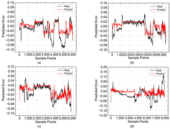 As mentioned before, the MA model is used to predict the prediction error of the NARX model. Figure 6 shows the prediction results of the MA model on the six flight cycles in the testing dataset. In Figure 6, the black line represents the real value, which is the prediction error of the FAE-LSTM model in Figure 5. The red lines represent the prediction results of the MA model. As can be seen in Figure 6, the MA model can predict the trend of the real error successfully.