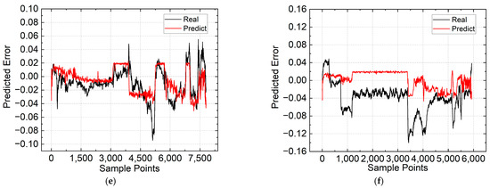 The results of the MA model for error prediction on the testing dataset. (a) #1 flight cycle, (b) #2 flight cycle, (c) #3 flight cycle, (d) #4 flight cycle, (e) #5 flight cycle, and (f) #6 flight cycle.