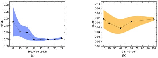 In the first experiment, we explore the influence of various network structures on the RMSE performance of the FAE-LSTM model, including the sequence length and neuron cell number. Each network is trained over five different random seeds, and the mean and variance of the RMSE performance are demonstrated in Figure 7, representing the long-term performance on the test dataset. As illustrated in Figure 7a, the sequence length significantly affects the RMSE performance, where shorter sequence lengths result in higher mean and variance values. Notably, sequence lengths greater than 14 yield stable performance, with the optimal sequence length being 16. As presented in Figure 7b, the cell number of the attention layer in the FAE-LSTM has less impact on the long-term performance than the sequence length. The network performance is best when the number of neuron cells is 40, and, as the number of neurons increases, the variance of the network prediction results decreases.
