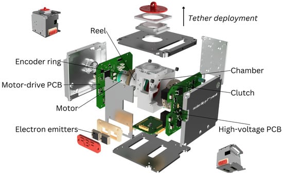 The IPB payload is a system developed by the Finnish Meteorological Institute based on Coulomb drag propulsion (CDP) technology. It is a novel deorbiting technology for LEO satellites [32]. As of April 2023, the IPB remains an unconfirmed technology for LEO and interplanetary applications [34]. Based on the in-orbit experience of ESTCube-1 and Aalto-1 missions [8,9], several improvements to the IPB design were introduced. Most notably, the tether deployment mechanism of the ESTCube-2 IPB payload was completely re-designed (Figure 4).