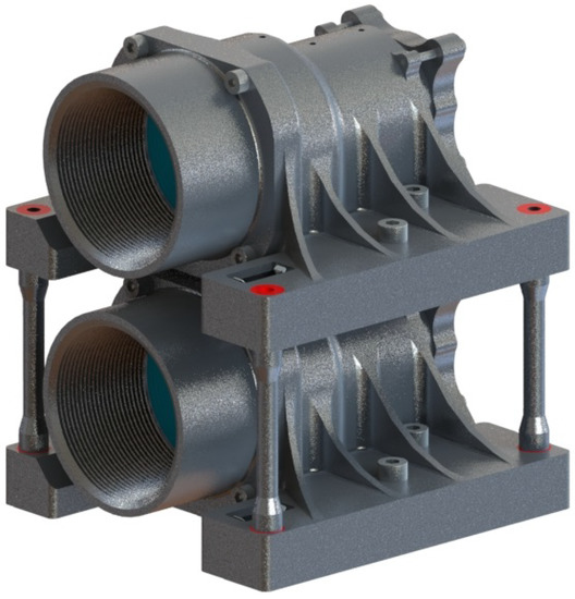 The EOP is a normalized difference vegetation index (NDVI) imager. The payload consists of two cameras (Figure 5) based on the design of the European Student Earth Orbiter’s (ESEO) secondary camera [35]. Each camera was modified with a simplified, more cost-effective baffle design [36] and a minor electronics redesign for CubeSat space protocol (CSP) compatibility. Each camera sensor has a different COTS band-pass filter: 660 (30) nm and 857 (30) nm. The spectral bands have been selected to be similar to Sentinel-2 bands 4 and 8a: 665 (30) nm and 865 (20) nm, respectively [37]. This will facilitate potential comparative analysis; however, we expect some discrepancies caused by mismatched COTS filters. The diagonal field of view is 9.56, and from an altitude of 500 km, the ground resolution is 22 m per pixel.