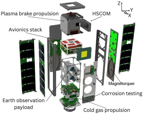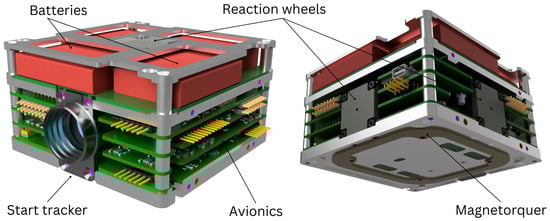 Exploded view of the 3U satellite, which showcases the satellite and its systems’ arrangement. The attitude and orbit control system (AOCS) components are distributed throughout the satellite—in the avionics stack (see Figure 8), cold gas propulsion, magnetorquers on side panels of X− axis Y+ axis directions, and sensors on the six side panel PCBs.