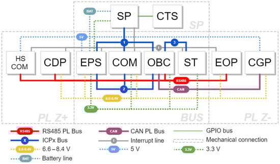 The inter-system electrical and the data-connections architecture. SP: side panels, CTS: Corrosion Testing in Space, HSCOM: high-speed communications, CGP: Coulomb drag propulsion (Ionospheric Plasma Brake), EPS: electrical power system, COM: communications system, OBC: onboard computer, ST: star tracker, EOP: Earth observation payload, CGP: cold–gas propulsion.