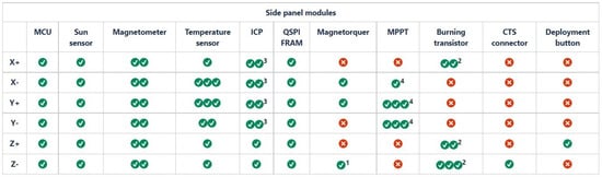 Side panel configuration table. 1. The bottom Z-axis side panel controls the magnetorquer. However, the coil driver components are physically on the ST PCB. 2. Resistor count for deployable structures. 3. Both internal communication protocol (ICP) buses for redundancy. 4. Additional maximum power point trackers (MPPT) for deployable side panels.