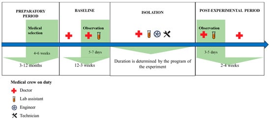 The pre-experimental (or baseline) period starts with the order of the IBMP director on the beginning of the background investigations and lasts up to the set of the isolation. All the selected candidates sign the informed consent for the participation in the experimental studies, then the testers (a tester is a volunteer participant of the experimental studies) are acquainted with the conditions of the experiment and the particular investigations, which are performed in popular written form, so that the volunteers have a clear idea of the procedures to be conducted and are aware of the associated risks.