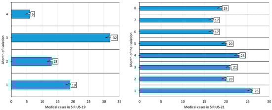 Out of the 70 clinical cases in the 4-month isolation, 48 cases (69%) required medical intervention. In the 8-month isolation, the medical intervention was carried out in 91 clinically significant cases out of the 163 (56%). A total of 7 out of 70 cases (10%) in the SIRIUS-19 and 12 out of 163 cases (7%) in the SIRIUS-21 demanded corrections in the daily schedules. It is worth noting that these corrections did not affect the scientific programs. Medical manipulations were conducted in 11 cases out of 70 (16%) in the 4-month isolation and in 6 cases out of 163 (4%) in the 8-month isolation.