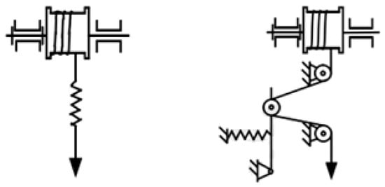 The buffer mechanism is essentially an elastic link. Its function is to suppress high-frequency disturbance signals in the system and improve the control accuracy of sling tension. In order to achieve this function, elastic links are usually added to the system to reduce the equivalent stiffness of the sling. At present, the commonly used method is to directly connect the spring in series in the sling. This method is simple to realize. The lower the spring stiffness, the smaller the tension error on the sling, but the lower the spring stiffness, the greater the elongation, and the more likely the spring to resonate, so the actual application is subject to more restrictions. Therefore, the spring mechanism is used to tension the sling to keep the tension at all times. At the same time, the equivalent stiffness of the mechanism is reduced through reasonable mechanical structure design to reduce the tension fluctuation of the output within a certain stroke. The principles of these two devices are shown in Figure 4.