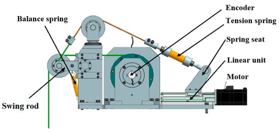 The buffer mechanism is a by-pass tension-type constant-force mechanism, which is composed of a swing rod, spring, and mechanical connecting device. The specific structure is shown in Figure 5. The swing rod is subject to tension spring, balance spring, and sling tension. At the initial moment, the torque of the swing rod is balanced. The swing rod is in the horizontal working position. When the tension fluctuates, the swing rod will rotate and apply tension to the sling.
