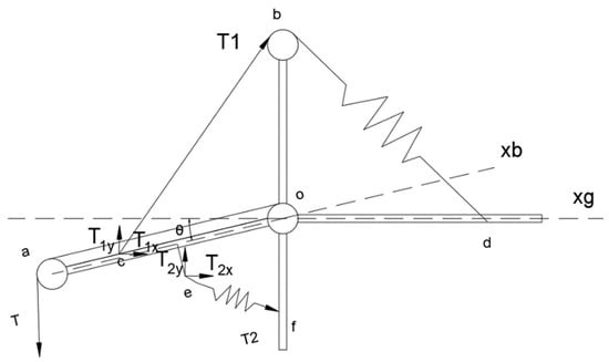 The specific structure of the buffer mechanism of the constant-tension system has been described in the previous article. The schematic diagram of its working position is shown in Figure 6. Taking the intersection point of the swing bar and the longitudinal bar as the origin O, an xg rectangular coordinate system is established. In the actual structure, the center of the drum and the origin of the coordinate system is not at the same point, but the sling between the two parts is only used to transfer the tension. Therefore, to simplify the model’s establishment, the center of the drum coincides with the origin O.