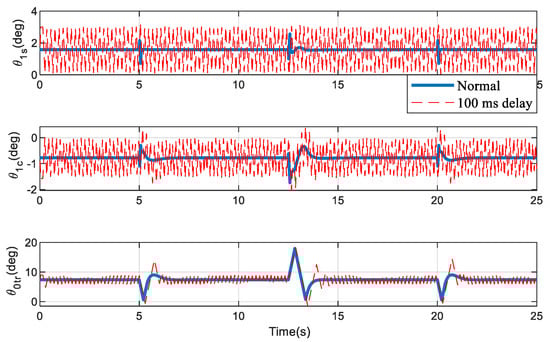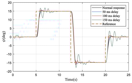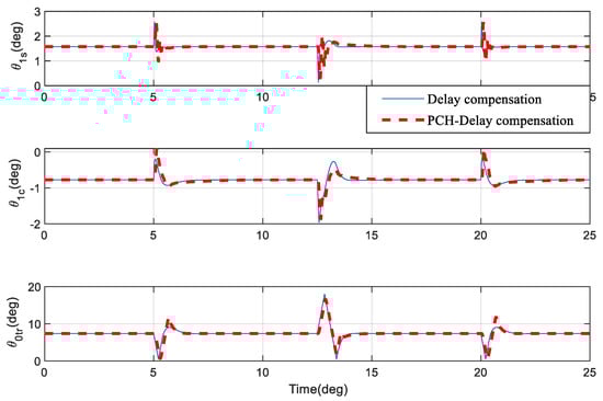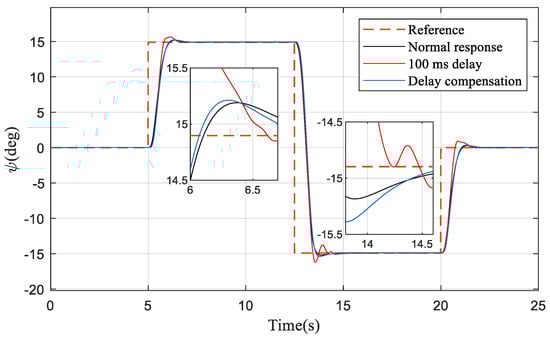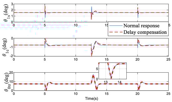 In the next simulation, the delay time between the controller and actuators is set at 100 ms. In Figure 5, it can be seen that, when the delay compensation is applied, the state overshoot is significantly reduced and the system’s rapidity is also improved compared to the original response. Figure 6 shows that, in addition to the need for a larger control effect, the original phenomenon of rapid changes has disappeared.