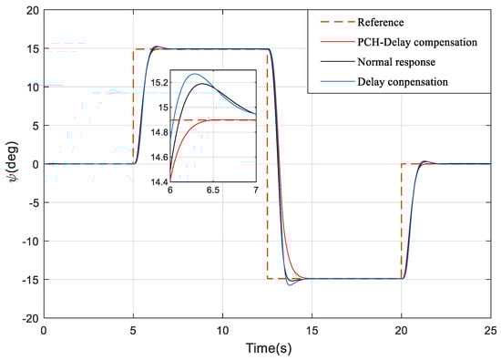 On the basis of delay compensation, we carry out the PCH design for the system. The advantages of PCH can be seen in Figure 7, which not only eliminates the overshoot, but also reduces the 0.7 s settling time of the system. Figure 8 is also given here to compare the changes of the actuators between the three cases.