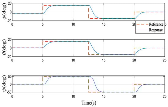 Finally, the response of the three channels of the attitude angle under the proposed control scheme is given in Figure 9. It can be seen that the three Euler angles can be decoupled and show good dynamic characteristics. In the Figure 10, the angular rates also change regularly corresponding to the tracking of the three Euler angular rates. Furthermore, the system can also track the command signal well when the actuator input is saturated and delayed, which can be observed in Figure 10.
