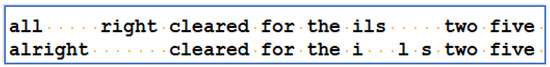 At the lexical level, MITRE’s ontology specifies that both speech and non-speech sounds during ATC radio communications should be captured in the transcription. Furthermore, the transcription should closely represent the sounds present in the audio without additional annotation or meaning inference. This means speaker hesitation sounds such as “um” and “uh”, partially spoken words, foreign words such as “bonjour” or “ciao”, and initialisms such as “n d b” and “i l s” are transcribed as they sound. These rules were based on best practices in automatic speech recognition training corpus creation.
