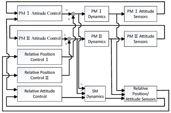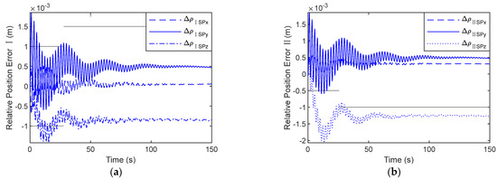 The simulation results are shown from Figure 5, Figure 6, Figure 7 and Figure 8. Figure 5 presents the relative position error curve of PM I and PM II, whereas Figure 6 depicts the attitude curve and angular velocity curve of SM. Figure 7 illustrate the attitude curve and angular velocity curve of PM I, respectively. Similarly, Figure 8 shows the attitude curve and angular velocity curve of PM II.