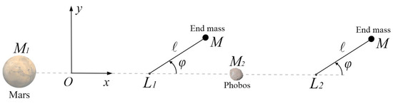 The space tether is a type of tether that is made of high-strength fiber used to connect spacecraft to each other or to other masses. The space tether systems allow us to perform missions that are impossible, impractical or unprofitable to accomplish with the help of other space equipment. For example, tether systems can be used for docking between spacecraft [1], as a space elevator [2,3,4,5,6], for payload orbital transfer [7,8], for exploring deep space [9], the atmosphere and the surface of the planets and their moons [10], as well as asteroids. For instance, Mashayekhi and Misra studied the effect of attaching a tether and ballast mass to an asteroid with subsequent cutting of the tether [11]. In recent decades, the use of space tethers near the collinear Lagrangian points has received considerable attention [12,13,14,15]. Ref. [14] focused on the development of a new mission to explore Phobos using a tether system anchored below the L1 Mars–Phobos libration point and deployed toward Mars at a length slightly greater than the distance from Phobos. Paper [15] showed the maintenance of an L1-type artificial equilibrium point in the Sun (Earth + Moon) circular restricted three-body problem by means of an electric solar wind sail. The tether capture system is also a promising method for removing space debris [16,17,18,19,20,21]. The topic of dynamics and control of tether systems has received substantial attention [22,23,24,25,26,27,28,29,30,31,32,33,34,35,36]. Huang et al. examined several new applications for the space tether during operation in orbit, focusing on the structure, dynamics and control [23]. Paper [24] discussed the diversity of tether modelling that has been undertaken recently, and showed that dynamics and control are the two fundamentally important aspects of all tether concepts, designs and mission architectures.