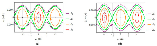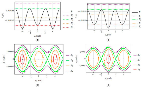 (a) The potential energy for the tether system attached at the libration point; (b) the potential energy for the tether system attached at the libration point; (c) phase trajectories corresponding to different levels of the total energy for the tether system attached at the libration point; (d) phase trajectories corresponding to different levels of the total energy for the tether system attached at the libration point.