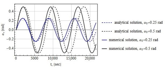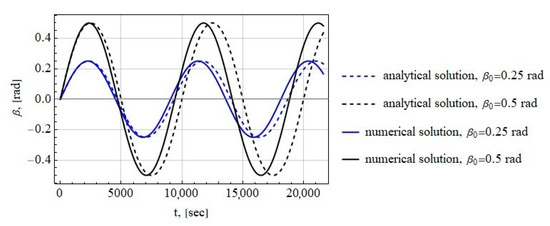 Let us compare the obtained analytical solution Equation (30) with the results of numerical integration of the initial Equation (2). Figure 4 illustrates the simulation results for m and the following initial conditions for the tether system attached in the libration point: