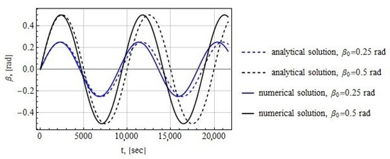 The comparison of the numerical and analytical results shows that the approximate analytical solutions are able to accurately predict the amplitudes of tether angular oscillations, but not the frequencies. However, in the considered case, the amplitudes are much more important for the analysis of tether oscillations, so the approximate analytical solutions are quite consistent with the numerical solutions.