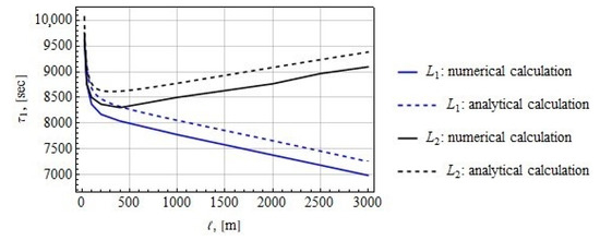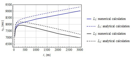 Figure 9 shows the dependence of the oscillation period on the length of the tether attached in the and libration points based on analytical and numerical calculations for the initial tether deflection angle rad.