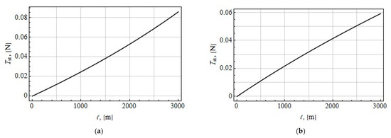 For the 50 kg end mass and the tether length of 3000 m attached in the libration point, Equation (44) gives the tension force of 0.086 N. When considering the libration point, the tension force is 0.059 N.