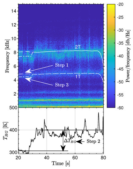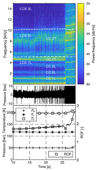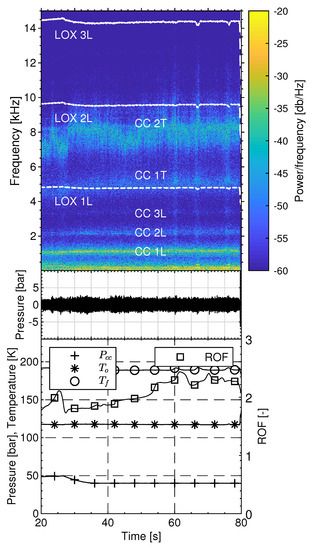 The regions of interest for both correction factors are indicated by dotted lines in Figure 5. Based upon the hardware configuration used and the operating conditions achieved (considering a nominal combustion behavior) in these experiments the longitudinal correction factor and the transverse correction factor were calculated as 0.88 and 0.61, respectively. The variable is the equilibrium sound speed in the combustion chamber calculated by NASA CEA [15] dependent on the combustion efficiency . Here, D is the diameter and L the length of the chamber, m, n, and q are integer variables for radial, transverse, and longitudinal modes, respectively, and is the m-th root of the radial derivation of the nth order Bessel function of first kind divided by . Finally, a correction for the influence of axial flow through the chamber is performed with the mean Mach number in the combustor . For example, considering a nominal and stable combustion behavior Equation (1) provides frequencies between 4862 and 4975 Hz for the 1T mode and frequencies between 8050 and 8240 Hz for the 2T mode in Test F.