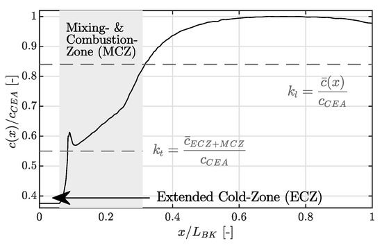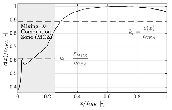 Here is the ratio of the averaged speed of sound throughout the extended cold-, mixing- and combustion zone to the speed of sound by CEA assuming chemical equilibrium. An enlargement of the cold-zone leads to a reduction of . For an estimation of the lift-off distance the cold-zone is extended in an iterative process until the resulting in combination with Equation (1) matches the experimental measured frequency. The distance of the cold-zone extension equals the estimated lift-off distance. The adjusted speed of sound profile with an extended cold-zone and the adjusted correction factors is visualized in Figure 8. Again, the regions of interest for the calculation of these factors are indicated by dotted lines.