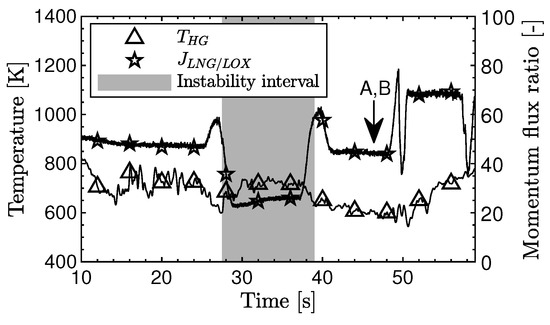 The momentum flux ratio (J-number) plays an important role in models describing the forces which govern the primary breakup of the LOX jet in shear coaxial injectors [18,19,20]. Higher values of J enhance the mixing processes between oxidizer and fuel [21]. Thus, the influence of the momentum flux ratio, calculated according to Equation (5), on the flame anchoring mechanism will be investigated.