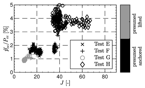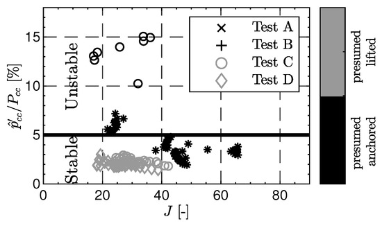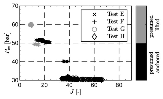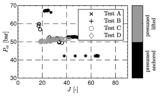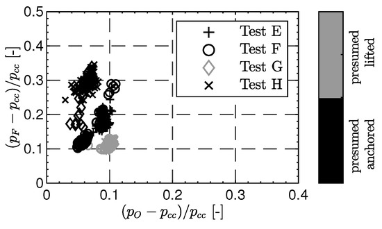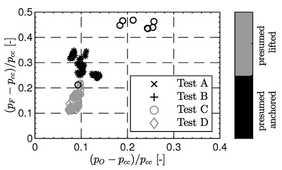 Figure 10 shows the pressure drop between fuel manifold () and combustion chamber () plotted against the pressure drop from the oxygen manifold () to the combustion chamber () for the tests A–D with recessed injectors. The pressure drop values are normalized by the chamber pressure. It can be observed that the load points, which were identified to have a lifted flame due to the lifted flame detection procedure, also have a lower pressure drop for the fuel injection. The LOX pressure drop is unaffected by flame anchoring location [9].