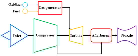 The air turbo rocket (ATR) engine is an air-breathing, wide-range combined propulsion device that consists of an inlet, compressor, gas generator, turbine, afterburner, and nozzle [1,2]. The working principle of the ATR engine is illustrated in Figure 1. In the gas generator, LOX and kerosene undergo controlled combustion reactions to generate high-temperature and high-pressure fuel-rich combustion products. These products drive the turbine, while the turbine powers the compressor responsible for compressing the air. The compressed air passes through the outer passage, while the fuel-rich combustion products flowing from the turbine pass through the inner passage, resulting in secondary combustion in the afterburner. The afterburner subsequently generates high-temperature and high-pressure gases, which are then accelerated through the nozzle to produce thrust [3,4]. The ATR engine combines the technical advantages of a rocket engine and an aero engine, resulting in a high thrust-to-weight ratio and a high specific impulse. As a result, the ATR engine can operate over a wide range of velocities and in a broad range of airspace [5,6]. Additionally, the compressor’s air intake requirements vary under different operating conditions, and the turbine powers the compressor through the gas generator. Consequently, the gas generator in the ATR engine must possess a significant flow regulation capability to accommodate the ATR engine’s operation across a wide range of conditions.