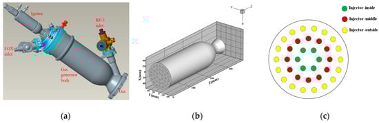 Structural sketch of the gas generator. (a) Gas generator; (b) the computational domain of the gas generator; and (c) the injector arrangement of the gas generator.