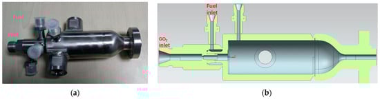 The torch igniter used was 194 mm in length, 32 mm in body diameter, 5.91 mm in outlet diameter, and 2.94 m in characteristic length, respectively and the characteristic length of the GO2/kerosene torch igniter was close to that of the LOX/kerosene gas generator. The physical structure of the torch igniter is shown in Figure 4a.