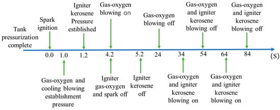 In the GO2/kerosene torch igniter experiment, GO2 and kerosene were supplied by a high-pressure gas holder and piston pump, respectively. The ignition time series is shown in Figure 5, and the working time of the torch igniter was 4 s. The gas generator pressure was obtained through setting a pressure sensor on the body of the torch igniter. The image of the torch igniter wake at different times is shown in Figure 6.