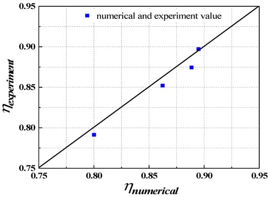Figure 7 shows the comparison between the experimental results and the numerical simulation results of the torch igniter combustion efficiency under four conditions. The abscissa and ordinate are the numerical simulation results and experimental results of combustion efficiency under the four conditions, respectively. It can be seen from Figure 7, that in the three conditions of Km = 0.454, Km = 0.557, and Km = 0.599, respectively, the numerical simulation results of the combustion efficiency are slightly higher than the experimental results. In the condition of Km = 0.656, the numerical simulation results of the combustion efficiency are slightly lower than the experimental results, with the maximum relative error (Relative error = (numerical efficiency − experimental efficiency)/experimental efficiency × 100%) of 1.41%, and the average error of 0.61%, and the error was within the acceptable range. Therefore, the computational method in this paper was deemed to be feasible.