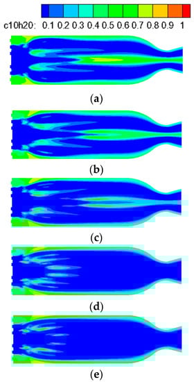 Figure 8 shows the contour of kerosene concentration distribution in the symmetrical section of the gas generator under the condition of m-1 = 0.10 kg/s (m-2 = 0.10 kg/s) and different Km-1. It can be seen from Figure 8 that the kerosene concentration near the wall of the gas generator was higher under different conditions, and the concentration gradually decreased along the flow direction. The main reason for this was attributed to the outer-ring nozzle of the gas generator being a monopropellant kerosene nozzle, and the ejected kerosene forming a low-temperature kerosene vapor film near the wall of the combustion chamber to reduce the wall temperature. Due to the kerosene from the outer-ring injector occurring turbulent diffusion with the propellant from the inner-ring and the middle-ring injector, partially cooled kerosene near the wall was involved in the combustion reaction, which caused the kerosene concentration near the wall area to gradually decrease along the flow direction. It can also be seen from Figure 8a–c that there is an area with a high kerosene concentration in the middle which reaches the central axis of No.1 to No.3 conditions. With the increase of the Km-1 and decrease of the Km-2, the kerosene concentration in the above area gradually decreased as a result. This is because the mixing ratio was lower, while the kerosene concentration was higher. When the mass flow rates of the inner-ring injector and the middle-ring injector were fixed, with the increase of the Km-1 (the kerosene mass flow rate of the inner-ring injector decreases), and when below the stoichiometric ratio (when fuel and air are completely burned, the ratio of fuel quality to air quality), a slight increase in the mixing ratio was found to be more conducive to the combustion reaction, and in this area the combustion was more sufficient, leading to the gradual decrease in the kerosene concentration in the middle reaching the central axis. Furthermore, Figure 8d–e demonstrates that as Km-1 increases, there is a general decrease in the kerosene concentration in the middle reaching of the central axis, indicating increased kerosene participation in the combustion reaction.