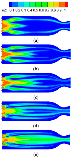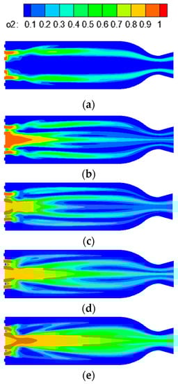 Oxygen distributions of y = 0 plane under different local mixing ratios. (a) No.1 (Km-1 = 0.43, Km-2 = 3.80); (b) No.2 (Km-1 = 0.70, Km-2 = 2.79); (c) No.3 (Km-1 = 1.00, Km-2 = 2.24); (d) No.4 (Km-1 = 1.69, Km-2 = 1.69); and (e) No.5 (Km-1 = 2.33, Km-2 = 1.45).