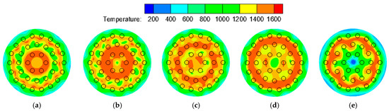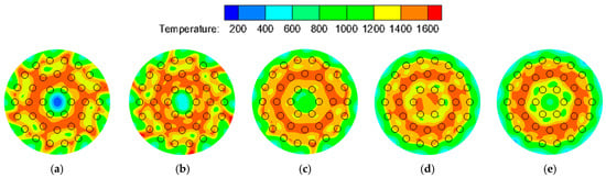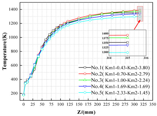 Temperature distributions of z = 210 mm cross-section under different local mixing ratios. (a) No.1 (Km-1 = 0.43, Km-2 = 3.80); (b) No.2 (Km-1 = 0.70, Km-2 = 2.79); (c) No.3 (Km-1 = 1.00, Km-2 = 2.24); (d) No.4 (Km-1 = 1.69, Km-2 = 1.69); and (e) No.5 (Km-1 = 2.33, Km-2 = 1.45).