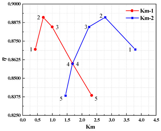 Figure 13 reveals the variation of combustion efficiency under the condition of m-1 = 0.10 kg/s (m-2= 0.10 kg/s) and different Km-1. The numbers near the data points in Figure 13 represent the condition numbers, with the same number indicating the same condition. From Figure 13, it is evident that as Km-1 increases (or Km-2 decreases), the combustion efficiency of the gas generator increases from condition No.1 to No.2 and decreases from condition No.2 to No.5. The combustion efficiency reaches its peak value of η = 89.10% when Km-1 = 0.70 and Km-2 = 2.79 in condition No.2, respectively. The combustion efficiency can be represented with the residual oxygen concentration of the gas generator outlet by comparing Figure 9 with Figure 13, where from No.1 to No.5 conditions in Figure 9, the oxygen concentration at the outlet of the gas generator initially decreases and then increases, and reaches the lowest value under the No.2 condition (with outlet oxygen concentration of 5.64%), which is consistent with the results shown in Figure 13. A lower residual oxygen content indicates more complete combustion and a higher combustion efficiency. Conversely, a higher oxygen excess leads to a lower combustion efficiency.