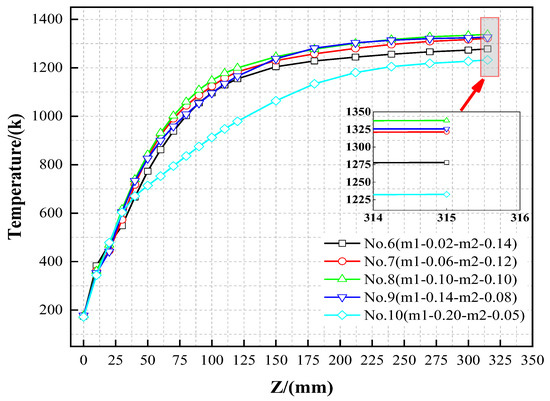 Figure 16 shows the average temperature profiles of the cross-section in the different axial distances from the injection plane under the condition of Km-1 = Km-2 = 1.69 and different m-1. According to Figure 16, the temperature rose rapidly at z = 0–120 mm, and the slope of the curve was large. From z = 120 mm to the outlet, the temperature rise rate then decreased gradually, and the temperature rise curve was gentler. The reason for this was similar to the observations made of Figure 10, whereby as both the kerosene and oxygen concentrations near the injection panel were high, this is conducive to the rapid combustion reaction. With the combustion reaction proceeding, the concentrations of kerosene and oxygen gradually decreased, causing the combustion reaction rate and the temperature rise rate to decrease.