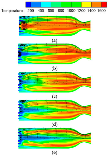 Figure 17 shows the temperature distribution and velocity streamline diagram in symmetry plane of gas generator under the condition of Km-1 = Km-2 = 1.69 and different m-1. It can be seen from Figure 17 that in the symmetry plane of the gas generator the high-temperature area mainly has two areas: the center axial area and near the wall area (about 80% radius position), and the two high-temperature areas are mainly affected by the inner-ring injector and the middle-ring injector, respectively. With the increase of m-1 and the decrease of m-2, it can be clearly seen that the high-temperature area near the center of the gas generator gradually decreases and moves downstream. It can be further seen in Figure 17a that the temperature of the center axial area of the gas generator was higher under the No.6 condition, especially near the injection panel, and the temperature was close to 1600 K. This was mainly due to the m-1 in the No.6 condition, whereby the longer residence time of the propellant in the gas generator represented the more sufficient combustion reaction, resulting in a higher temperature in the center axial area. In addition, due to the m-2 being large and the m-1 being small in the No.6 condition, the difference in mass flow rates led to a recirculation area between the inner-ring injector and the middle-ring injector, and the existence of a recirculation area greatly increased the residence time of the propellant, meaning the combustion is more sufficient, and the combustion temperature is increased as a result. Generally, it is advisable to avoid high-temperature areas near the injection panel as they can cause injector ablation and significantly affect the reliable operation of the injector. From Figure 17b–e, the effect of changing the m-1 and the m-2 on the temperature distribution of gas generator was found to be complementary to the effect of Figure 15b–e on the oxygen concentration distribution. This occurs as a higher mass flow rate in the inner ring injector results in a higher local flow rate, thereby reducing the residence time of oxygen and kerosene in the gas generator. As a result, the combustion reaction becomes less complete, leading to a higher amount of residual oxygen. Therefore, compared with Figure 15b–e and Figure 17b–e, where the higher the oxygen concentration, the lower the local temperature distribution.