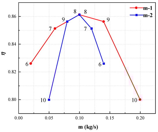 Figure 19 shows the variation of combustion efficiency under the condition of Km-1 = Km-2 = 1.69 and different m-1. The number next to each data point in the figure represents the condition number, and the same number represents the same conditions. It can be seen from Figure 19 that the combustion efficiency of a gas generator under different conditions was more than 80%. With the increase of m-1 (or the decrease of m-2), in the conditions from No.6 to No.8, the combustion efficiency of the gas generator was found to have increased, and in the conditions from No.8 to No.10, the combustion efficiency of the gas generator was found to have decreased, and the combustion efficiency reaches its maximum value of η = 86.13% under the No.8 condition (m-1 = m-2 = 0.10 kg/s). This indicates that a more uniform flow rate of the propellant in the inner-ring injector and the middle-ring injector promotes the combustion reaction. Under the condition where the total propellant flow is unchanged, the change of flow distribution will cause a change in the local mass flow rate, thus affecting the local mass flow rate and the residence time of the propellant in the gas generator, resulting in an insufficient combustion of the propellant and a reduced combustion efficiency.