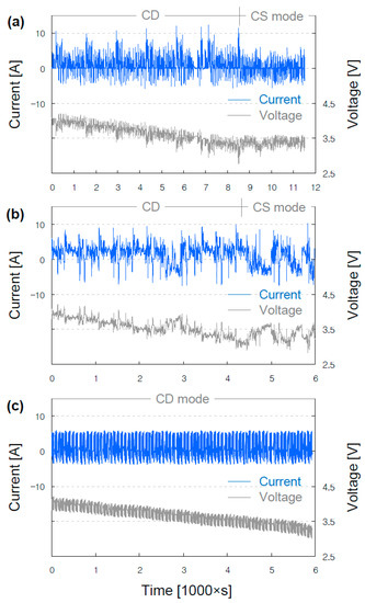 Our load profile needs to incorporate the operational modes evolving from CD to CS, as the flight phase of the hybrid UAM progresses from take-off to cruise. However, previous studies have only concentrated on load profiles that are close to the CD mode. Since a load profile for the UAM has not been established yet, data from the D-segment PHEV was adopted as a preliminary study. Similar to the UAM, the hybrid system in the PHEV initially operates in the CD mode solely using the battery at its upper limit of the SOC. When the SOC decreases to its lower limit, the mode switches to the CS, where the battery is replenished by a gasoline engine to maintain the SOC within a specific range. Figure 2 depicts an analogy between the operational modes of the hybrid UAM and PHEV. In order to diversify the characteristics of test data, three distinct load profiles were adopted: City, Highway, and High-speed. As their names indicate, the city profile is the least aggressive, while the High-speed profile is the most intense. As shown in Figure 3, the difference in characteristics is reflected in the magnitude and direction of the current, where positive values indicate battery discharge. The measured voltage is used as test data in the subsequent section. As noted, these load profiles were originally applied to a large LIB pack in the PHEV containing 96 cells, each with a nominal capacity of approximately 37 Ah. The magnitude of the current was scaled based on the C-rate to match with a smaller LIB cell used in this study. Except for the High-speed profile, the CD to CS mode transition in the City and Highway profiles occurs at approximately 15% SOC, which corresponds to 8500 s and 4300 s, respectively. The mode shift can also be noticed with a variation in the rate of change in the voltage.