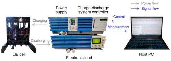In this study, a LIB cell (Samsung SDI, 18650-35E) with a nominal capacity of 3.5 Ah and a nominal voltage of 3.7 V was selected. The load profiles were simulated using the combination of a DC electronic load (Kikusui, PLZ1004W) and a DC power supply (Kikusui, PWR800L). The seamless transition between charge and discharge in the load profiles was facilitated by integrating these two pieces of equipment with a charge-discharge system controller (Kikusui, PFX2512) (see Figure 4). Apart from the current sensor built into the equipment, two additions were employed for cross-checking purposes: a hall sensor (LEM, DHAB S/145) and a shunt resistor (YOKOGAWA, 2215-09) (see Table 2). The latter uses direct measurement of the flow of current, which is proportional to the voltage drop across the shunt resistor within a circuit. On the other hand, the former uses indirect measurement of the magnetic field generated by the current flowing through a circuit. Each method has its advantages and disadvantages that are tied to the underlying physics of its measurement principles. When accuracy is a top priority, shunt resistors have a clear advantage as they rely on direct measurement. Despite having documented accuracy specifications, it is challenging to determine the actual measurement error of a non-contact Hall sensor due to the potential effects of various external influences. This indicates that Hall sensors tend to be susceptible to noise and are prone to bias. In contrast, Hall sensors are more compact, making them a good choice for applications where size minimization is important. This is particularly serious in high currents because a shunt resistor would have a footprint directly proportional to the magnitude of the current being measured. Taken together, a Hall sensor can surpass shunt resistors, as long as its bias is effectively compensated. The accuracy of the current measurement can be evaluated with sensitivity. The Hall sensor used in this study, with a sensitivity of 10 mV/A, was four times inferior to the shunt resistor’s 2.5 mV/A resolution. In the following section, the effect of this difference on the accuracy of SOC estimation is experimentally demonstrated. Furthermore, the effect of this difference is minimized by correcting the bias in the Hall sensor while estimating the SOC.